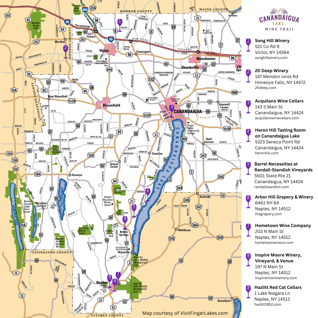 A boutique collection of unique wineries on the western edge of the Finger Lakes Wine Region, the Canandaigua Wine Lake Trail is small but outstanding. You will find spectacular scenery and fine wines, along with amazing restaurants and craft breweries, hotels and B&Bs, attractions, shopping, and golf.