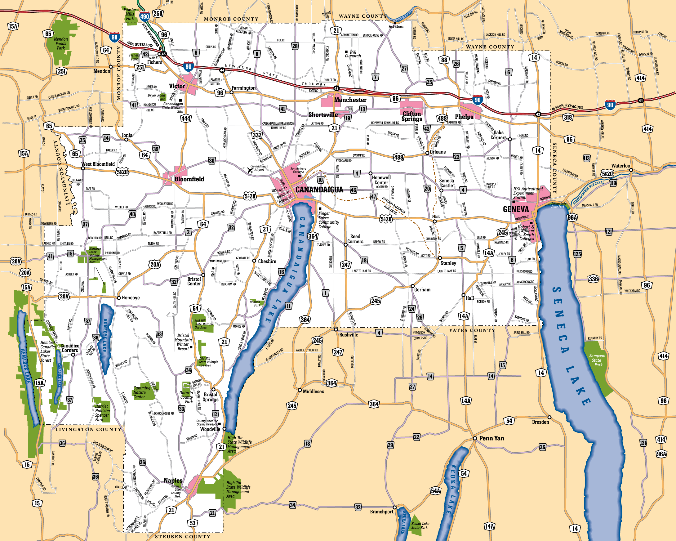 The Finger Lakes vacation area is 14 counties between Lake Ontario to the north and Pennsylvania to the south. This map shows all the lakes and the major highways from Western New York (Buffalo and Niagara Falls) to Syracuse and points a tad east.